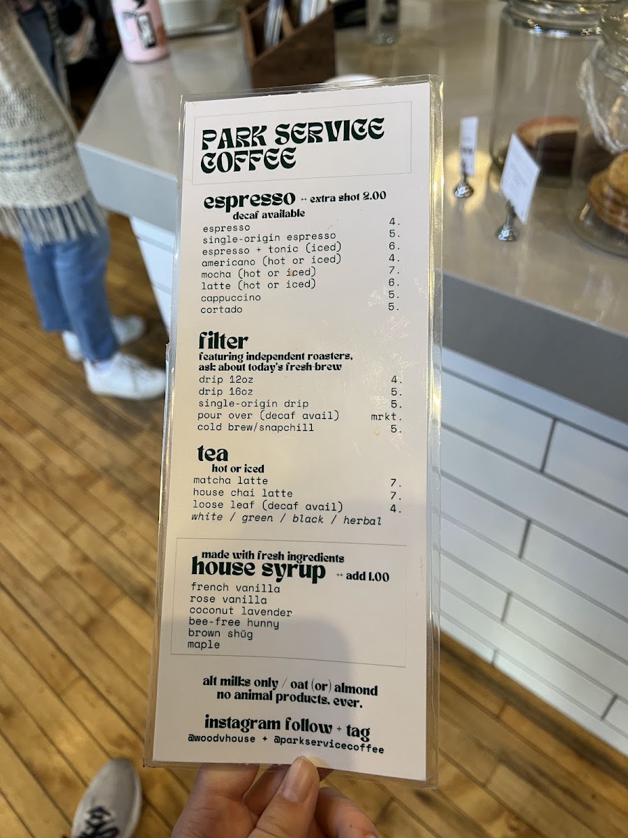 The menu at Park Service Coffee primarily features a selection of coffee and tea beverages alongside a variety of baked goods. It is organized into several key categories to accommodate different preferences and times of day.